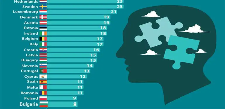 Най-ниският процент е регистриран в България (със 76 психиатри на милион жители), следван от Полша (90), Малта (95), Испания и Румъния (и 106), Кипър (112), Португалия (120), Словения (128) и Чешката република (146). ( 1 ) ( 2 )
